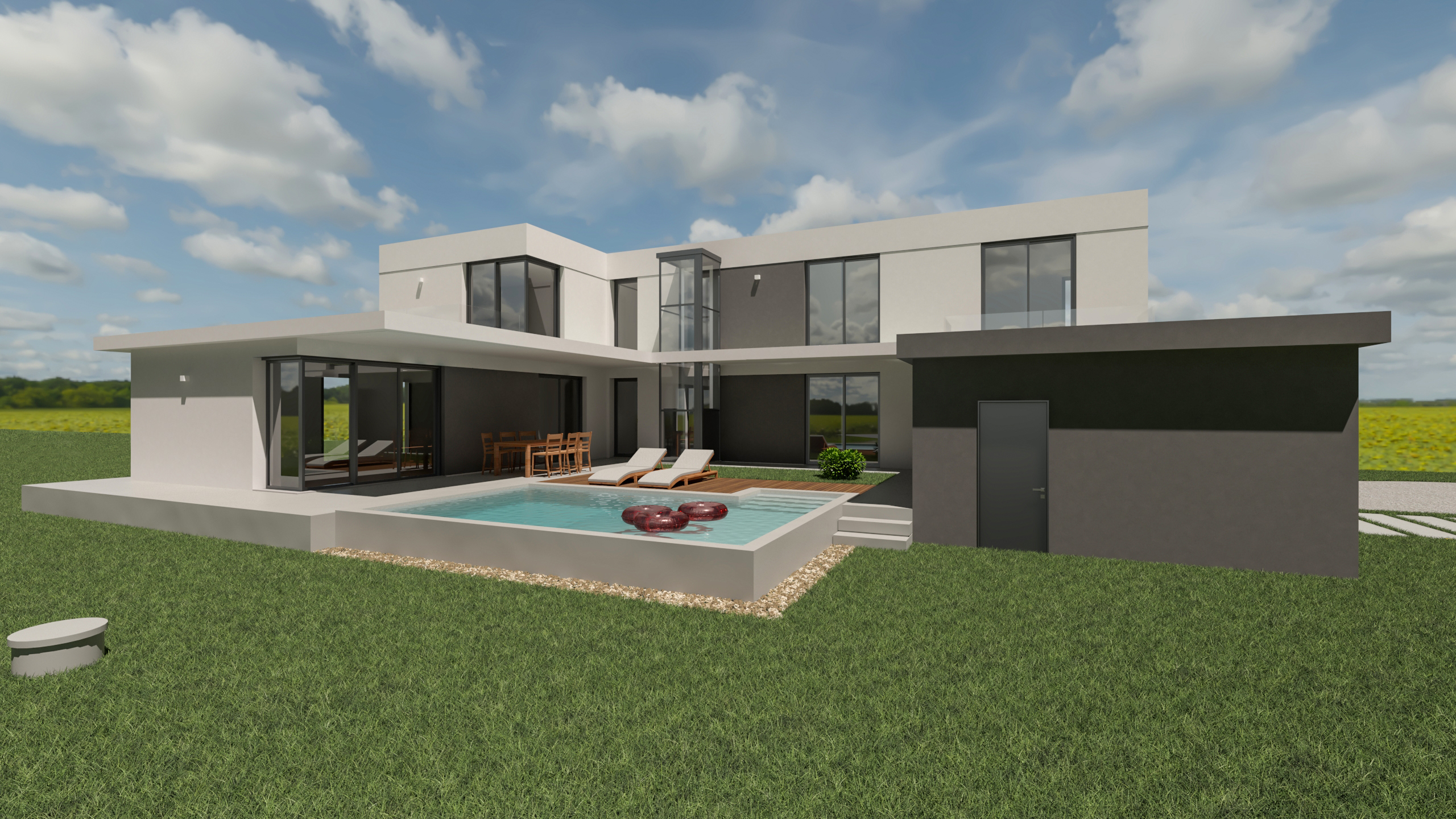 Para que os clientes compreendessem a necessidade da composição da moradia em L de modo a aproveitar da melhor forma a orientação solar do terreno, foi feito um vídeo a demonstrar a incidência do sol na zona de lazer e piscina durante um dia de verão.