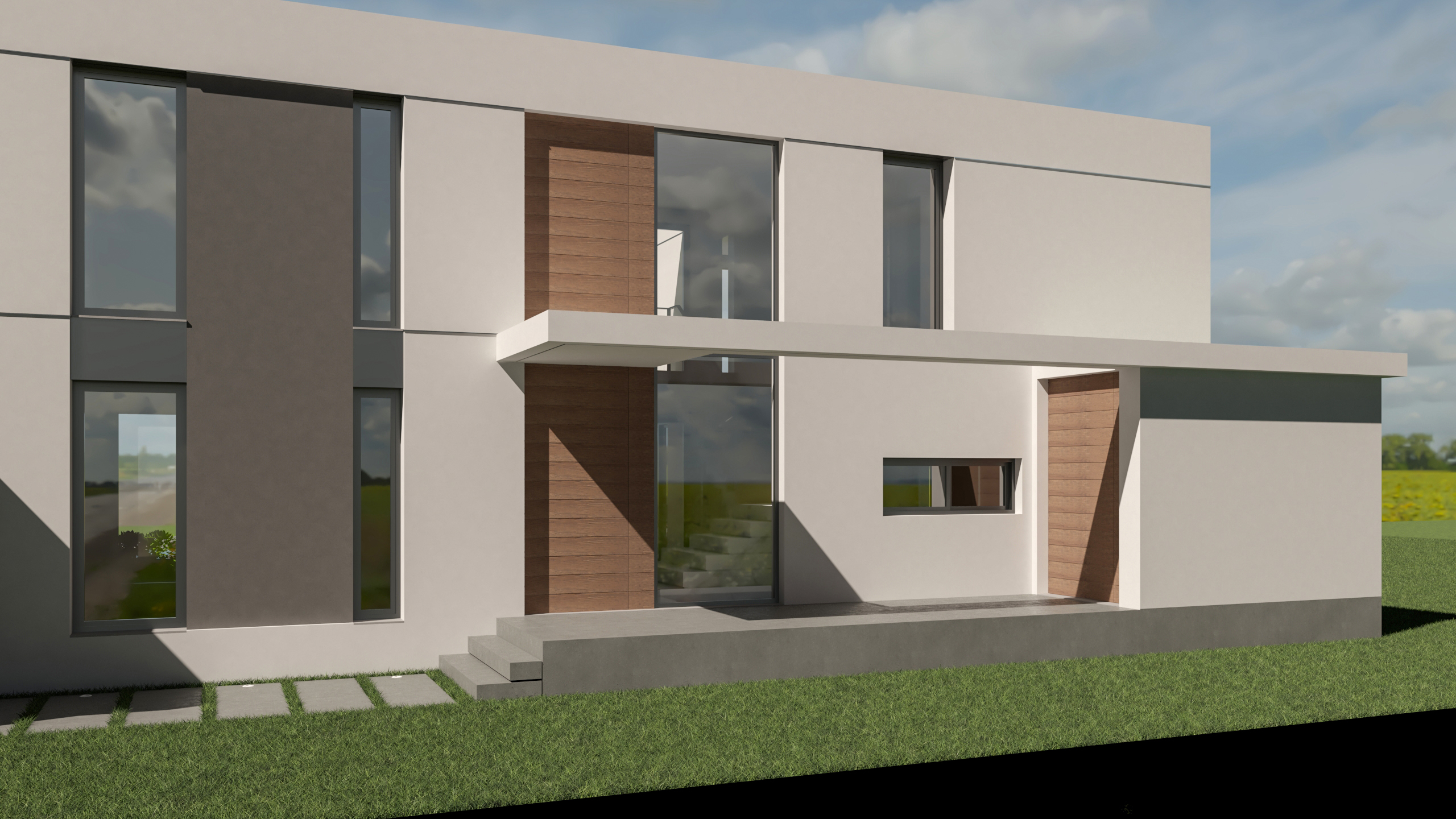 Criou-se também uma zona de entrada com duplo pé direito, estilo mezzanine, enfatizando esta zona central da casa, também com vista para a piscina, e uma entrada independente e directa para a despensa e cozinha, localizada mesmo junto à entrada principal, exigência esta feita pelo cliente.