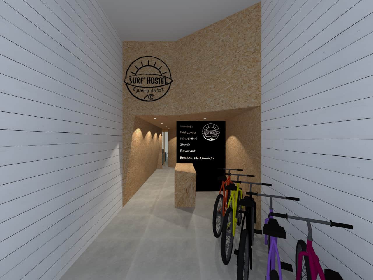 Criando uma ligação directa entre a Escola de Surf pertencente ao cliente, e este Hostel, pensou-se imediatamente que este espaço teria de corresponder às expectativas desse tipo de hóspedes. Tendo noção da limitação do espaço, não havendo terreno disponível para ampliações, e a existência de alguns problemas estruturais no edifício principal, que terão de ser resolvidos em obra, a garagem existente converteu-se na recepção do Hostel, onde haverá um serviço de aluguer de bicicletas e um serviço directo de marcação de aulas de Surf, com transfer directo para a escola. O pátio coberto transformou-se em zona de estar, a instalação sanitária em balneários mistos, e o restante espaço em quartos.